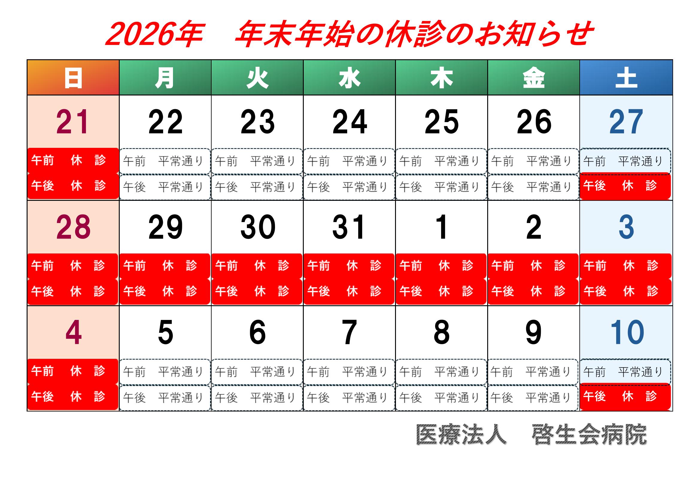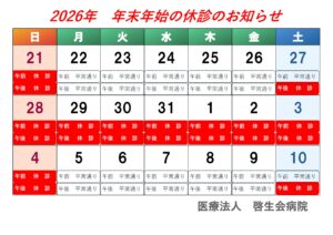 2025年12月~2026年1月の年末年始の外来休診予定についてお知らせします。